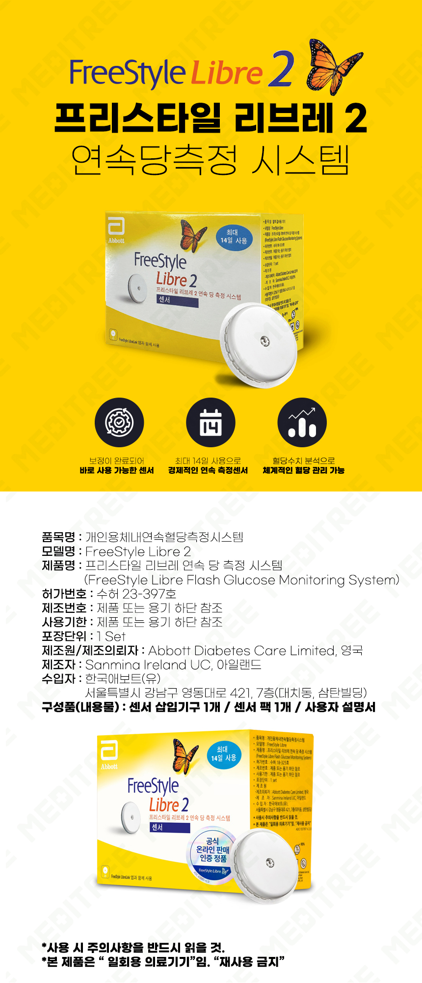 일회용 의료기기, 최대 14일 사용, 바로 사용 가능한 센서, 체계적인 혈당 관리